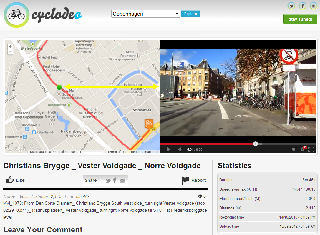 Cyclodeo is a dynamic website that synchronizes Maps, GPS tracks and cycling videos. It allows cyclists to visually check route characteristics including, safety, traffic levels, local points of interest and landmarks before they travel. The Challenge Today, a growing number of European citizens are choosing to cycle to school, work and for shopping. This trend is great news for most of us aspiring to live in smarter and greener cities. Unfortunately, many neighborhoods are not safe and convenient for cycling. Tragedies are often reported in the news such as last November when six cyclists were killed in 13 days in London. One of the problems with most biking directions applications is that you are never entirely sure how safe the biking route is before setting off. For instance, many of these applications usually suggests roads you would never consider cycling on and ignores far safer and quieter roads. We propose a solution to address this issue by allowing anyone to preview they cycling rides from the safety of their homes. The Solution Cyclodeo is a dynamic website that synchronizes Maps, GPS tracks and cycling videos in one page . When a ‘Cyclodeo ride’ is being replayed, a moving mark is highlighted on the map to indicate the current location of the viewed video. Since each section of the video is geo-coded, you can click anywhere on the cycling track to visualize a specific location from a cyclist’s perspective. When a city is covered, it allows anyone to see exactly what street conditions they might encounter on a particular cycling ride. We intend to introduce the service in more European cities for the benefit of their citzens. Target group and social impact The Cyclodeo platform can assist in: 1) Monitoring the bicycle traffic and identifying dangerous sections of the road network. 2) Classifying cycling paths based on their type and comfort. 3) Highlighting infrastructure quality for Transport Planners and showcasing infrastructure improvements. This way, citizens can be visually reminded of the good work going on to improve cycle route infrastructure with new routes. 4) Complementing existing awareness tools used and enhancing its profile to a larger audience through social media. 5) Showcasing picturesque cycle routes, supporting tourism marketing initiatives as well as encouraging cycling in and around tourism venues/areas. Competences of the applicant ICT, Entrepreneurship, project execution, management, business development, communication, marketing and PR.