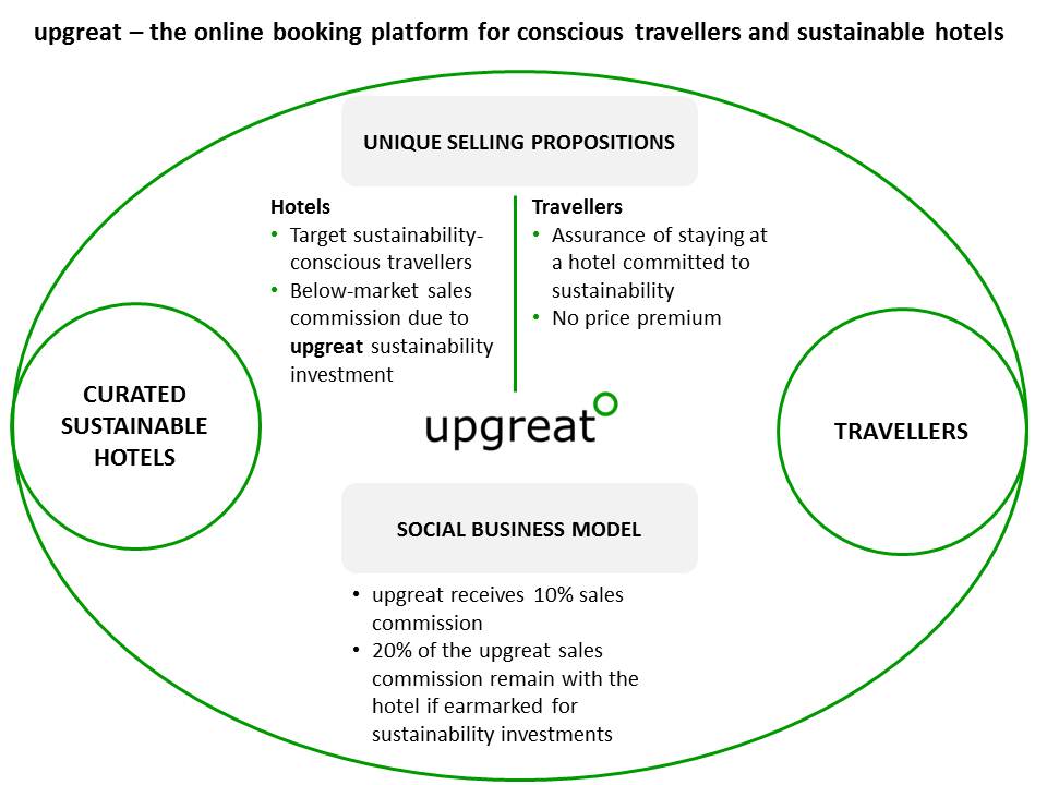 UPGREAT builds the online booking platform to connect conscious travellers and responsible hotels. UPGREAT invests a percentage of the sales commission into the sustainability of its partner hotels. The Challenge Sustainability in the hotel industry is still in an infant stage as compared to other sectors such as consumer goods. Less than 1% of European hotels are certified according to a sustainability standard whereas approx. 70% of the timber and 20% of the coffee consumed in the EU are certified as sustainable. The main challenges are the lack of economic incentives for hotel owners to commit to sustainability as well as the travellers' awareness of the social and environmental benefits of staying at sustainable hotels. Online booking platforms constitute an established and continuously growing distribution channel for hotels (global sales in 2013: approx. 15 bn EUR). As an online booking platform, UPGREAT aims at using this market lever to transform the hotel industry to become sustainable. The Solution UPGREAT will be a booking platform for sustainable hotels as well as conventional hotels committing to become more sustainable. UPGREAT provides unique selling propositions for each target group: Target group and social impact UPGREAT aims at providing benefits for both hotel owners and travellers alike: Hotel owners will receive financing and improved access to finance for sustainability investments while enhancing their marketing profile with high-value sustainability-conscious travellers. Travellers will benefit by staying at sustainable accommodations, which, i.a., serve healthier (organic) food, use less chemical cleaning detergents and respect labour standards. UPGREAT specifically targets the increasingly growing LOHAS (Lifestyle of Health and Sustainability) customer segment which are considered to already constitute 10-30% of the travel market. Competences of the applicant Sustainability expert with 4 years of project management experience in sustainability standards (tourism, agriculture, forestry, fisheries) for the German Development Co-operation GIZ; previous positions with the European Commission, the German Agency for Renewable Resources, and the German Federal Foreign Office; entrepreneurial spirit with a sound business background (M.Sc. in Management).