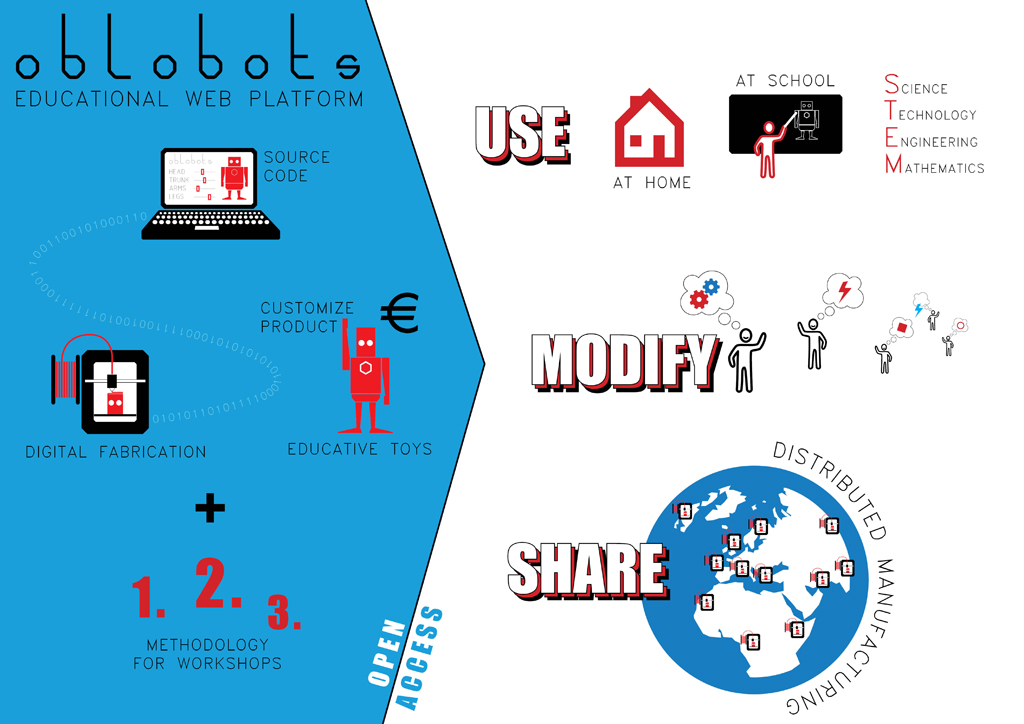 Oblobots is an open source platform to facilitate education on science, technology, engineering and mathematics. It offers tools that allows the public to create user-adjustable objects to introduce children to digital fabrication and robotics. The Challenge Society has been empowered to create their own consumer technological products in the last decade, through the spread of open hardware electronics and the democratization of digital manufacturing tools. Making society aware of the amount of new possibilities for education that this new landscape offers, starts by allowing children to use and understand these powerful tools. We want to create an open source learning platform to offer means that empower the educational community with knowledge to introduce themselves into digital fabrication, electronics and robotics. By offering this platform to schools we give advantage to innovation and to create scientific awareness through society, that in the long term will certainly have a positive impact on the competitiveness of the European Union. The Solution This educational platform will empower all actors in the educational ecosystem in STEM (science, technology, engineering and mathematics). It will be focused in a prototype of an educational robot called Oblobot, as a mean to teach concepts of electronics, robotics and personal and digital fabrication for children. Oblobot prototype will be open source and highly customizable in order to cover a huge range of needs. It will be also compatible with other open hardware platforms like arduino. Open source training materials will be available: guidelines to run STEM workshops with Oblobots and digital files for 3D print Oblobots to run the workshops. We will run workshops to test these materials, and it will be susceptible to modification and improvement by the community of users. Target group and social impact With our open source platform the educational community will have access to new ways to bring innovation and create scientific vocation among young people. Moreover, this project will have a positive impact on society, as bringing them tools to discover and approach science and technology, it is a way of empowerment. It will facilitate the participation among every agent at the educational ecosystem. They will benefit from a tool designed to engage themselves, as at an open source project, they will be able to modify and improve tools and content. It will be shared and published using the platform allowing the whole community to have access to it. This will improve the offer of teaching materials in electronics, robotics and digital fabrication for our everyday needs in STEM education. Competences of the applicant Sara Alvarellos @trecedejunio architect, designer and co-founder of Makespace Madrid. Jorge Medal is an industrial designer, he develops the @oblomobka project, which focus on parametric design and local fabrication in a networked world.