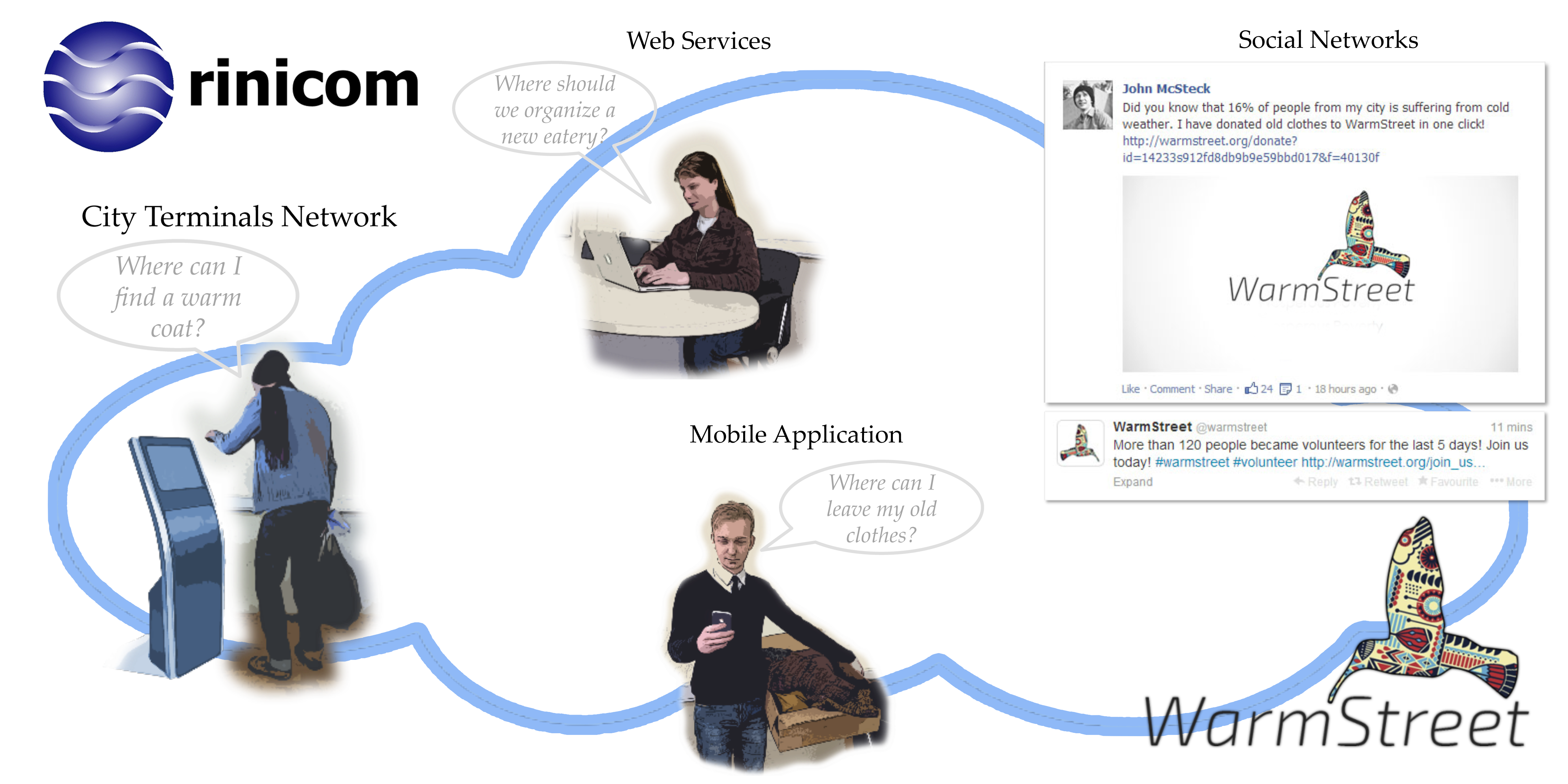 WarmStreet creates a solidary web portal to network social services, charity organisations, economic partners, citizens and people experiencing poverty and social exclusion and provide timely assistance to those that are most vulnerable. The Challenge The fight against poverty and social exclusion is at the heart of the European strategy for smart, sustainable and inclusive growth. More than 120 million people in the EU are at social risk while the economic crisis undermines the sustainability of social protection systems. Great potential to address social challenges is now seen in innovative civil society engagement forms. The active involvement of governments, social and economic partners, citizens and vulnerable people is catalytic in producing effective sustainable results, as projects evolve into lasting collaborations. The challenge is to make available collaborative spaces where social and technological innovations combine to ease the creation of successful social endeavours fighting poverty and social exclusion. The Solution WarmStreet combines web services, mobile applications and social networks as a services platform to build an online community linking those in need and those willing to minimise the burden of poverty and social exclusion. Target group and social impact WarmStreet is ideal for social services, charity organisations, economic partners and citizens wanting to help minimise the burden of poverty and social exclusion in their community, by tracking assistance requests and providing services that benefit the lives of those most vulnerable. As a promising social innovation platform, WarmStreet engages the civil society in creating and sustaining the ecosystem required to meet social challenges and make a positive difference in individuals, families and the involving community. The impact of WarmStreet's socio-economic benefits is even larger when considering the collection of valuable data to help monitor poverty and social exclusion and its contribution to lessen the burden on local, regional and national public social services systems. Competences of the applicant Rinicom is a leading provider of internet-based communications and information systems, such as Good Citizen, comprising online platform and mobile applications linking citizens to emergency response organisations. Rinicom's team gathers solid skills, competences and experience in the development of online platforms, mobile applications and wireless secure communications.