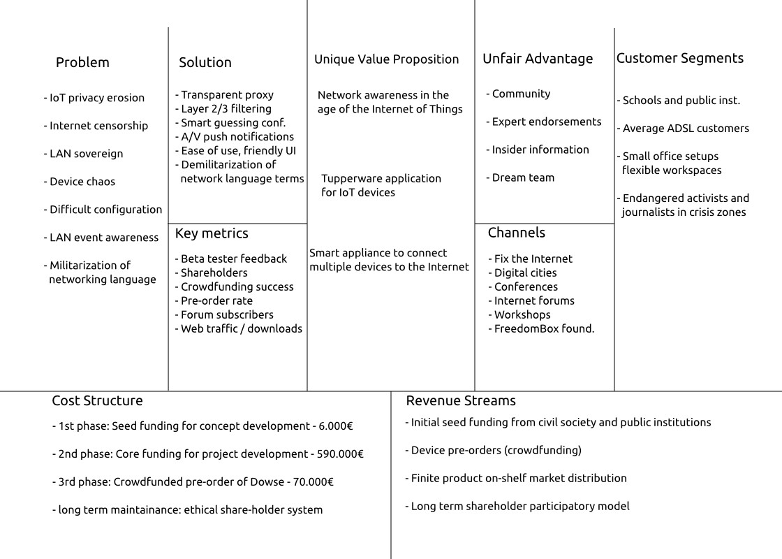 Networks in the age of the Internet of Things will be full of people's devices with access to their private, common and public information. Dowse makes people conscious about what happens in the network space around them. The Challenge Networked devices with access to all kinds of private informations can talk to each other without humans even asking and without making such interactions manifest. Such a situation raises issues that are not just technical, but socio-political, about the responsibility for connections that happen without human consent, within local networks and towards the outside, to and from the Internet. The risks of unconscious abuse or exploitation of information asymmetry is growing tremendously. As things initiate the networked context of users, we are making a major leap towards a world that provides us with contexts that we may not want at all. Getting some insights on such situations is crucial for societies at large. The Solution Dowse is a free and open source transparent proxy facilitating the awareness of in-going and out-going connections from and to a local area network. By replacing the outdated proprietary ISP ‘gateway’ with an open and user-visible device, Dowse introduces a malleable communications hub to the language of the small network. The entrance or departure of a device from the local Internet of Things ecosystem is accompanied by audiovisual interactive aspects and such interactions extend to the new presence or absence of a communications channel, for example between an electrical meter, a corporate cloud, a kids tablet or a journalist mobile phone. First deliverables: Target group and social impact Anyone running a local area network (LAN) at home or at an office can benefit from Dowse. In a highly connected home environment, Dowse will provide an easy to use interface for the inhabitants will be conscious about the data flows going in and out of their private LAN, being prompted to deal with new devices when they appear: from a new electricity meter to a mobile phone or computer. Dowse also enhances the privacy of people surfing the Internet in cases where confidentiality and integrity of research conducted from an office premise or at home is important. At last, Dowse can enable responsible parents to deal with the freedom of their kids to browse the Internet still avoiding aggressions by malware, phishing and and other kind of intrusions into their experience. Competences of the applicant Waag Society (NL) is an interdisciplinary non-profit media lab researching and developing new technology. Dyne.org is a non-profit committed to research and development of free and open source software: since its birth in 2000 several radio makers, humanitarian organisations, artists, medics, activists and educators employed and redistributed its software worldwide and free of charge.