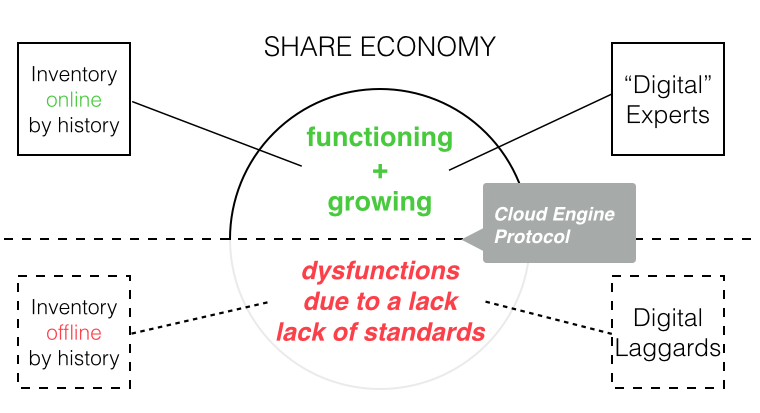 Share economy is creating a large number of new opportunities to connect redundant resources such as social capital, production facilities, services, etc. - we are developing an universal API that makes this inventory interconnectable. The Challenge The challenge of share economy are lacking standards to address resources that are presently “offline” by design or origin. Whereas we increasingly can use inventory that is “on the digital grid” by its technological design, as e.g. the automotive industry and increasingly enhanced online functionalities of e.g. in-car systems used for e.g. finding free parking spots, the grand socio-economic challenge is, how we can make inventory online addressable that is not “digital by default”. The challenge we are proposing to solve is how we can better use the benefits of share economy by enhancing IOT interoperability of resources and its compatibility across share economy applications. The Solution We are developing an API for socio-economic relationships capable of managing inventory and to digitally process and match demand and supply relationships in multi-stakeholder networks and setups. We developed an accounting system that is agnostic of classes of goods, resources or infrastructures, and this way able to compute in real-time any kind of online-mediated exchange of labour / services, resources and production processes via mobile applications. Contrary to existing b2b solutions, we are addressing market segments that are presently ignored by the technology industry: We are building age-friendly technologies that enable demographics that “are presently offline” to use online IOT technologies and participate in digitally-mediated share economy services. Target group and social impact By enabling groups that are presently not benefiting from collaborative consumption ideas, principles and concepts, we hope to enhance awareness and opportunity recognition towards share economy themes. Our products are especially addressing target groups that are today lacking the necessary digital literacy to pro-actively participate in digital concepts that can enhance the effective and sustainable use of resources. By providing especially these users with a new set of tools, we can effectively scale the idea of share economy by making it as understandable and reliable as possible to audiences so far not participating in it (hence a lack of understanding and tools): We help people understanding the diversity of share economy by providing tools that make collaborative consumption easier. Competences of the applicant The applicants are computer scientists and technology designers that have been working together in a number of projects. We both have the technical resources as well as the necessary expertise to successfully deploy the project. We are supported by a number of advisors that have been working in the technology industry and have long-term experience in developing real-time geo-spatial applications.