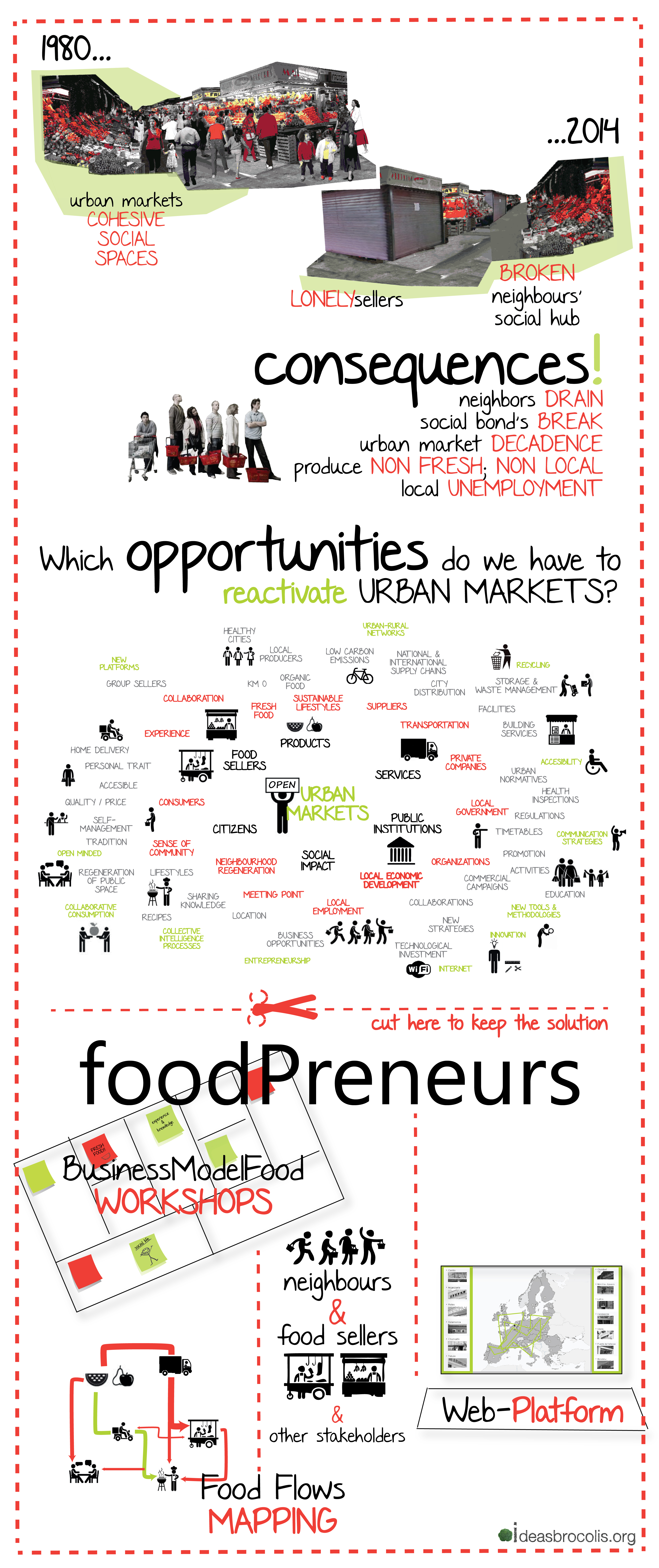 foodPreneurs is a digital platform which provides local small food sellers with a community to rethink and promote their business models in order to survive against the monopoly of big commercial areas, by using new tools and the support of customers The Challenge Local markets and grocery stores, also known for their relevance in the social life of a neighbourhood, are more and more being socially excluded by big commercial areas. Losing the shopping experience, the relation between the salesmen and the neighbours, and mainly, the consumption of fresh and quality products are some of the consequences. Markets are driven by experienced people that lack the skills to creatively rethink their business to compete against big supermarkets. Even though those sellers are placed next to each other, they feel a lack of support and collaboration channels. Besides, the daily buyer, as essential part of the urban market, cannot access information about food origins, its characteristics, its supply chains and the socio-environmental impact that it generates. The Solution foodPreneurs is an international small food sellers web platform to promote and redesign their food business models. Target group and social impact foodPreneurs regains the connections among neighbourhoods, their inhabitants, and the micro-economies that happen within those. Economic flows, specially food flows are essential to strengthen the social life and foster more sustainable lifestyles, since both the act of buying and the act of eating are essential in European societies’ daily life. Further, foodPreneurs helps confront the economic crisis and the monopoly of big commercial surfaces, by helping small local sellers adapt their businesses to the needs of the new consumers, which through the platform will become a sort of prosumers, contributing to the redesign of the shops where they buy in, becoming more engaged with those small markets. At the same time it will reactivate local economies, and the consumption of local produce. Competences of the applicant “Ideas Brocolis, Seeding Sustainable Change” is a non-profit organization whose aim is to promote an active citizenship that acquire sustainable lifestyles through new learning techniques and the introduction of the concept of sustainable development, providing the necessary tools and facilitating the knowledge for innovative, sustainable and human-centered designs. See more at: ideasbrocolis.org