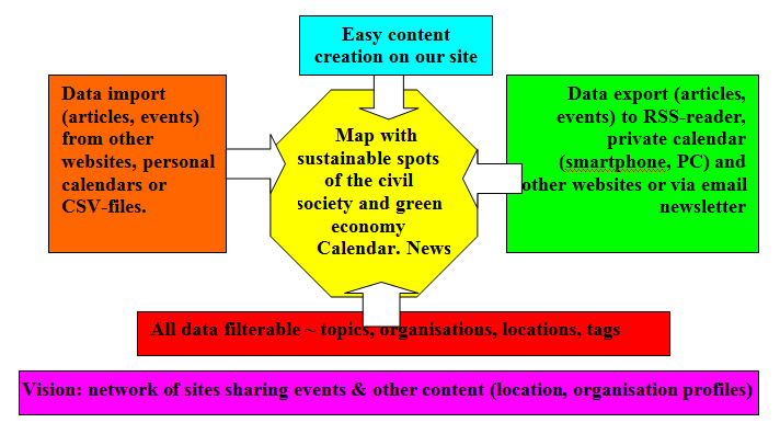 we are in contact with some european sustainability networks like transition network, the economy for the common good, community supported agriculture, global ecovillage network. we see the potential to use our data sharing functionalities to make one platform which brings all those projects together (so every network would provide an API with their projects and than they could displayed on a "map of change" on a central website for example). but that would be another bigger application ;-) an would need a bigger team and lots of communication between the networks..